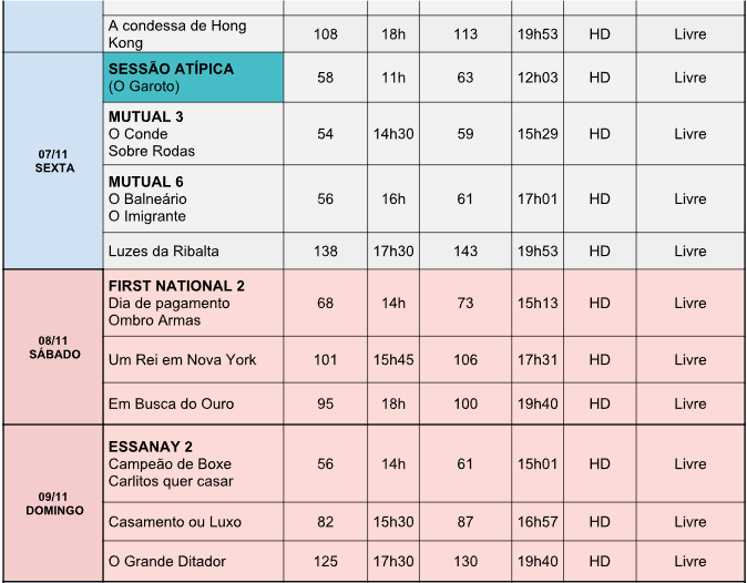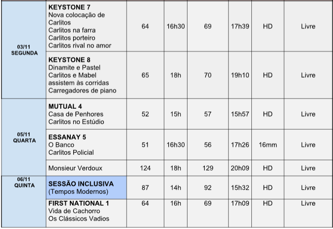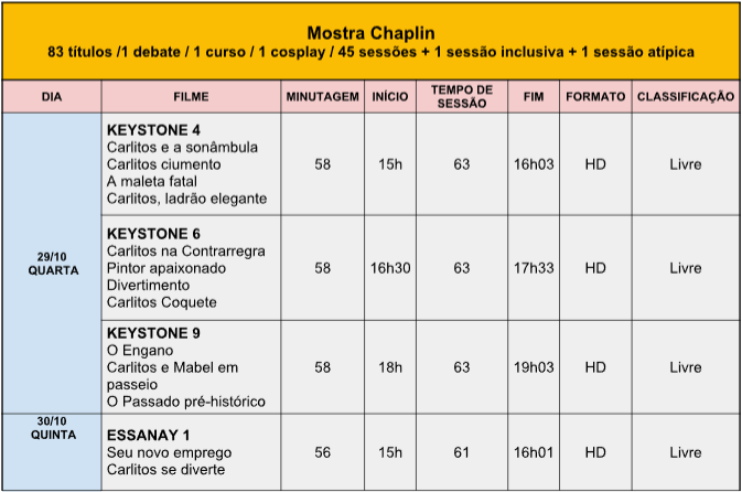 CHAPLIN é uma retrospectiva dedicada à obra do ator, diretor e compositor Charlie Chaplin, nascido em 1889 na cidade de Londres, foi o ator e cineasta mais proeminente dos primórdios do cinema mundial e um dos grandes ícones da cultura do século XX. A mostra CHAPLIN tem como objetivo principal a realização de uma retrospectiva completa dedicada à obra do ator, diretor produtor e compositor Charles Spencer Chaplin, mais conhecido como Charlie Chaplin. A mostra pretende exibir cerca de 83 filmes do diretor, dentre curtas, medias e longas-metragens de ficção, cobrindo todas as fases de Chaplin, dos primeiros estúdios do cinema mudo aos filmes da sua United Artists e o período falado.